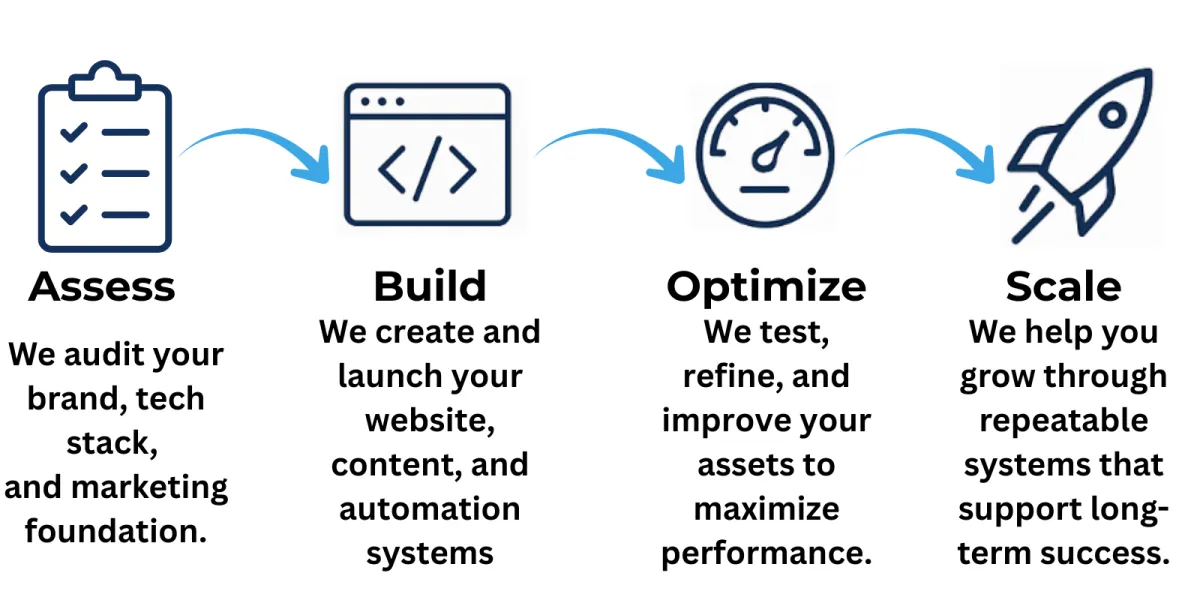 After your discovery call, we conduct a full audit of your brand and current systems. From there, we map out a custom strategy and begin building your assets, typically starting with your website, social content, and lead funnels.